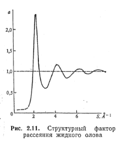 Звідси видно, що у разі одноатомних рідин і аморфних тіл середня відстань від фіксованого атома до його найближчих сусідів визначається по значенню S, відповідному будь-якому максимуму інтерференційної функції а(S). Це означає, що визначаючим в утворенні картини розсіювання одноатомними рідинами і аморфними речовинами є найкоротша міжатомна відстань R1 що повторюється в різних порядках інтерференції.