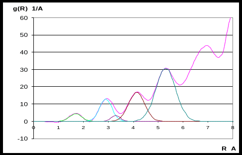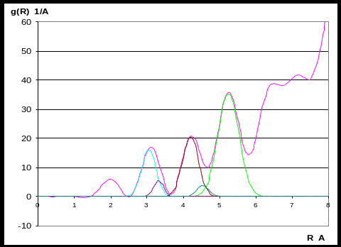 4. З побудованих радіальних функцій в середовище Excel були визначенні відстані та координаційні числа шляхом заміни кривої радіальної функції сумою чотирьох гаусовських кривих. Для вихідного Мо координаційні числа на відстанях першої, 3-ї та 4-ї координаційних сфер дуже близькі до кристалічного Мо, а координаційне число 2-ї координаційної сфери значно менше ніж в кристалічному. Таким чином були встановлені відстані для чотирьох координаційних сфер. При відпалах відстані координаційних сфер спочатку збільшуються, а потім зменшуються але не суттєво; але при 700 ºС третя координаційна сфера по суті має дві відстані: 4,2 Å та 4,54 Å, що свідчать про початок суттєвої перебудови структури.