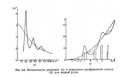На мал. 4.8 приведені нормована крива інтенсивності і крива 4πR2ρ(R) одержані для рідкої ртуті А. Ф. Ськришевськім сумісне з Д. П. Карлікової і Д. Н. Карликовим. Вимірювання інтенсивності проведені до значення sinθ/λ = 0,62 Å-1 що відповідає Smax = 7,8 Å-1. Поява помилкових максимумів по обидві сторони від істинних на кривій 4πR2ρ(R) можна чекати при 2,1 і 4,13 Å для R1 = 3,12 Å і при 5,2 і 7,1 Å для R2 = 6,2 Å.