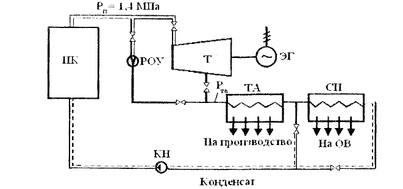 В большинстве случаев требующееся давление производственного пара на месте потребление не превышает 0,2-0,8 МПа. Целесообразно использовать энергию пара в турбине с противодавлением для производства электрической энергии и лишь затем направлять пар потребителю. При малых перепадах давлений (от 1,4 до 0,3…0,15 МПа) такая мощность достигается лишь при очень больших расходах пара. Производительность большинства даже очень крупных котельных такие расходы пара не обеспечивает, поэтому до последних лет пар дросселировался в РОУ [3].