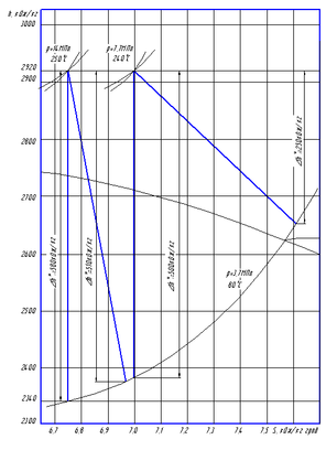 Проанализируем работу турбины на частичном режиме. Построим цикл работы в h-S диаграмме [2] (рис.17).