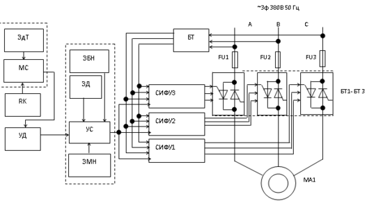Затем сигнал поступает на системы импульсно-фазового управления СИФУ1- СИФУ3, которые, изменяя углы отпирания тиристоров блоков БТ1- БТ3, плавно изменяют величину напряжения на обмотках статора МА1.