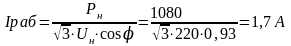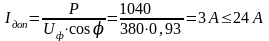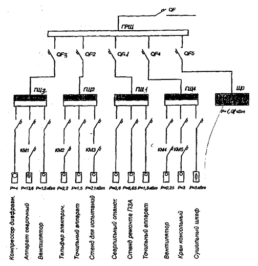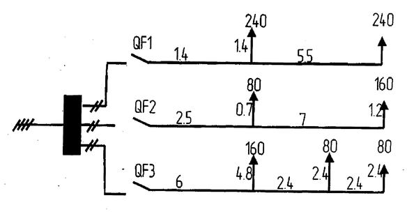 0,9-3 2,7 < L < 3 принимаем L = 2,9 м Число светильников в ряду: Число рядов светильников: где а и b - длина и ширина помещения, м Общее число светильников N= па · пb = 2 · 1 = 2 шт Индекс помещения: По справочнику [7] определяем коэффициент использования светового потока по известным значениям: I, Рпола, Рстен, Определяем расчетный световой поток: Выбираем лампу ЛБР-40. Световой поток одной лампы Фл=2500лм. Световой поток не должен превышать расчетный более чем на 20% и быть меньше 10%. Условие соблюдается. Принимаем к установке в помещении ремонта электрооборудования 15 светильников типа ЛСП23 -2х40 Расчетная установленная мощность светильников РУСТ=РСВ·n = (40·2}·2 = 160 Вт (6.8) Удельная мощность: Расчет остальных помещений БТОР выполняются аналогично, и результаты расчета сведены в таблицу 6.2 Рисунок 6.3 План БТОР с нанесением осветительных сетей 6.3.2 Электротехнический расчет Осветительные нагрузки базы технического обслуживания и ремонта электрооборудования разделены на группы. Для питания осветительных установок применяется напряжение 380/220 В. При составлении расчетной схемы следует руководствоваться следующими рекомендациями предельный ток группы не должен превышать 25 А. число светильников на однофазную двухпроводную группу не должно превышать 20 штук. длина четырехпроводной группы должна быть около 80 м, а трех и двухпроводной - 60 и 35 м. На расчетной схеме указываются все осветительные щиты и отходящие, число проводов и длина групп, мощность источников света и их удаленность от щита. Рисунок 6.4 - Расчетная схема осветительной сети Сечения проводов выбираются исходя, из допустимой потери напряжения и проверяются по нагреву и механической прочности. Допустимая потеря напряжения Рассчитываем внутреннюю проводку для осветительных сетей. Сечение провода для группы I: где Мi =I·Рi - электрический момент С - коэффициент, учитывающий число проводов, материал и напряжение питающей сети. Mi=2,8 · 0,24 +5,5 · 0,24 = 4,36 кВт –м. Принимаем сечение провода S = 2,5 мм2, АПВ. [9] Проверим на длительно допустимый ток: где UФ - фазное напряжение сети, В для провода АПВ S = 2,5 мм2, Iдоп=24 А. Уточним потери напряжения в сети: Сечение проводов для группы 2: Мгр2 =3,2 · 0,08 + 8,2 · 0,16 = 1,56 кВт·м Принимаем сечение провода S = 2,5 мм2, провод АПВ, Iдоп=24 А. Уточним потерю напряжения: Сечение проводов для группы 3: Мгр3=10,8·0,16+10,4·0,08+13,2·0,08 = 3,62 кВт·м Принимаем сечение провода S = 2,5 мм2, провод АПВ, Iдоп=24 А. Уточним потерю напряжения: Сечение провода на вводе ЩО: Принимаем сечение провода S = 2,5 мм2 , провод АПВ, Iдоп=24 А. Длительно-допустимый ток: Уточним потерю напряжения: 0,72%<2,5% Все осветительные сети подлежат защите от коротких замыканий. Кроме того, требуется защита от перегрузок сетей, выполненных открыто проводами с горючей изоляцией. Для защиты групп осветительных сетей выбираем автоматические выключатели типа ВА 5125, установленные в осветительном щите типа ПР 8501. Выбор автоматического выключателя проведем на примере первой группы.Условия выбора следующие: Uн.aвт.≥ Uн.сети 380 В> 220 В Iн.aвт.≥ Iраб. Iн.aвт = 25А> 1.35 А Iт.p.≥ Ip 5А>1.35А Iэ.м.р. ≥10 Iн.т.p. = 10 · 5 = 50 А Расчеты для второй и третьей групп про изводится аналогично. На вводе в осветительный щит выбираем автомат типа ВА 5125. Iн.aвт. = 25 А расцепитель комбинированный Uн.aвт.≥ Uн.сети 380 В = 380 В Iн.aвт.≥ Iраб. Iн.aвт = 25А> 1.7 А Iт.p.≥ Ip 5А>1.7А Iэ.м.р. ≥10 Iн = 10 · 5 = 50 А Проверка на срабатывание защиты при одн