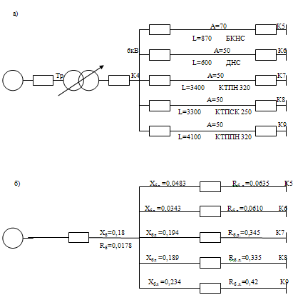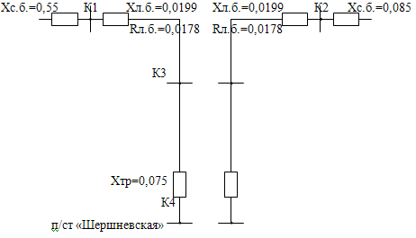 Для расчетов токов к.з. на стороне низкого напряжения п/с "Шершнёвская" используем параметры и схему изображенную на рис. 2.5(а). Схема замещения приведена на рис. 2.5(б). Результаты расчетов токов к.з., ударных токов, мощностей к.з. в расчетных точках приведены в табл. 2.3.