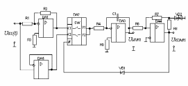 В состав ИС КР1108ПП1 входит активный интегратор, выполненный на основе ОУ, RS-триггер, работой которого управляют компараторы, а также источники стабильных токов и аналоговые ключи. Работа ПНЧ основана на интегрировании входного напряжения с последующим уравновешиванием накопленного заряда емкости интегратора импульсом стабильной площади по цепи обратной связи. Длительность импульса t0 стабильна и формируется одновибратором t0 = U0C0/I2.