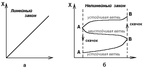 У стаціонарному стані, таким чином, значенні характеристики, наприклад, концентрації, лінійно змінюється залежно від значень обмеження, що управляє, і є для кожного єдиний стан Хs . Абсолютно однозначно можна передбачити стаціонарне значення Х при будь-якому,если мати хоч би два експериментальні значення Х(). Керуючий параметр може, зокрема, відповідати ступеню віддаленості системи від рівноваги . Поведінка в цьому випадку системи дуже схожі на рівновазі навіть за наявності сильно нерівноважних обмежень.