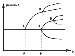 Аналіз стійкості в лінійному наближенні дозволяє перевірити, що рішення X = 0 під час переходу через R = 0 стає нестійким, а рішення X = R - стійким . Загалом випадки при зростанні деякого характеристичного параметра р відбуваються послідовні біфуркації . На малюнку 2.4. показано єдине рішення при р = р1, але при р = р2 єдиністю поступається місце множинним рішення.