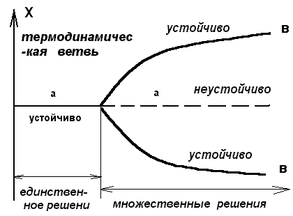 Поруч з рівноважним станом стаціонарний стан асимптотичних стійкий (по теоремі про мінімальне виробництво ентропії ), по цьому через безперервність ця термодинамічна гілка тягнеться у всій докритичній області. Досягши критичного значення термодинамічна гілка може стати нестійкою, так що будь-яке, навіть мале обурення, перекладає систему з термодинамічної гілки в новий стійкий стан, який може бути впорядкованим. Отже, при критичному значенні параметром відбулася біфуркація і виникла нова гілка рішень і, відповідно, новий стан. У критичній області, таким чином, подія розвивається по такій схемі