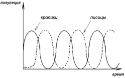 Абсолютно ясно, що насправді відбуваються періодичні коливання чисельності популяції кроликів і лисиць, причому за наростанні чисельності кроликів слідує наростання чисельності лисиць, які змінялися зменшенням чисельності кроликів, таким же різким зниженням чисельності лисиць, що супроводжується, потім підвищеним підйомом чисельності кроликів і так далі (мал. 3.7).