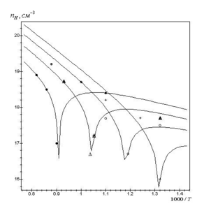 Для визначення констант рівноваги реакцій (ІІI – V) скористалися зонною теорією для невироджених напівпровідників. Константи рівноваги реакцій іонізації дефектів визначали згідно [3] за формулами: