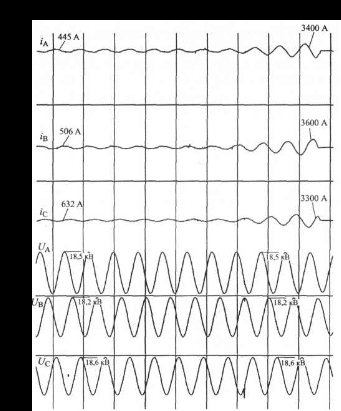 Из рис. 1.11 видно, что до отключения амплитуды фазных токов генератора составляли 450 - 470 А при амплитуде фазного напряжения 18,6 кВ. Приблизительно за два периода до отключения выключателя нагрузки амплитуды токов возрастают до 3,5 кА, а амплитуда фазного напряжения несколько снижается (до 18,2 кВ). Такое увеличение тока связано, видимо, с работой автомата гашения поля и переходом генератора из режима синхронного двигателя в режим асинхронного электродвигателя, в результате чего генератор набирает нагрузку (до 90 Мвар)
