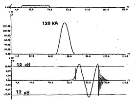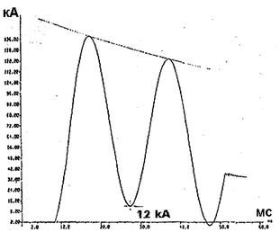 Ток отключения, измеряемый через трансформатор тока, практически воспроизводит ток отключения основной дугогасительной камерой, поскольку ток, отключаемый вспомогательной дугогасительной камерой, несоизмеримо меньше и воспринимается на осциллограмме как нулевая линия.