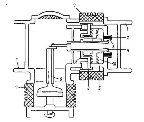 I - вводы; 2 – катушка магнитного дутья; 3 – неподвижный дугогасительный контакт, он же металлическое дугогасительное сопло; 4 – подвижной дугогасительный контакт, он же – второе сопло; 5 – главный неподвижный контакт; 6 – главный мостиковый контакт; 7 - изоляторы; 8 – компрессионный поршень; 9 – изоляционный вал-тяга; 10 – камера высокого давления;