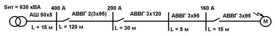 Выбираем кабель от двигателя до автомата типа АВВГ 3*95 Iдл.доп = 170 А.