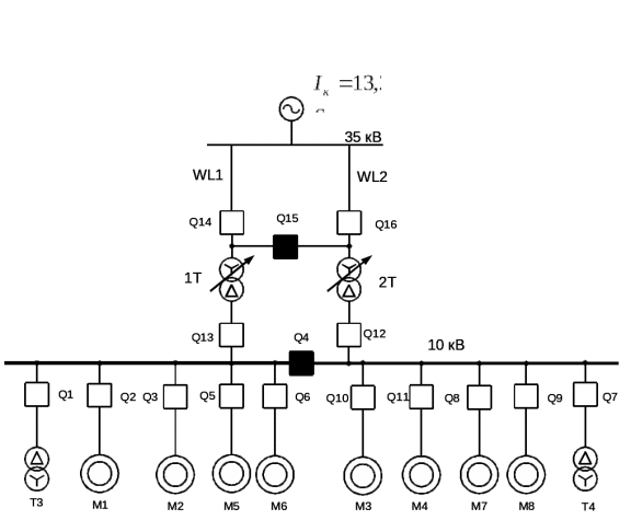 Трансформаторы Т1 и Т2 35/10 кВ в нормальном режиме работают раздельно, каждый на свою секцию шин КРУ.