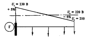 Рассмотрим линию местной сети, питающуюся непосредственно от генератора Г с номинальным напряжением Ur = U1. В линии имеет место потеря напряжения, поэтому приёмники электроэнергии, подключённые к ней, будут находиться под разными напряжениями.