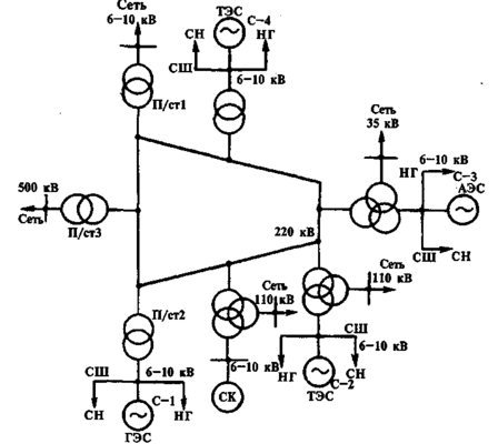 Рис.1.1. Принципиальная схема электрической системы: ТЭЦ, АЭС, ТЭС, ГЭС- теплоцентраль, атомная, тепловая, гидравлическая станции; СН- собственные нужды; СК- синхронные компенсаторы; СШ- сборные шины; НГ- нагрузка на генераторном напряжении; П/ст- трансформаторные подстанции.