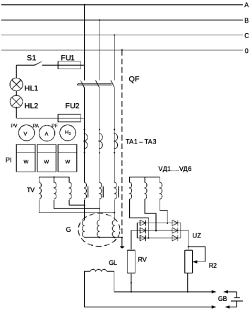 Обмотка статора G выполнена также, как у других генераторов ДЭС. У ротора явно выраженные полюса. На нем размещена обмотка возбуждения GL генератора, получающего питание от статистической системы. Ток в обмотке возбуждения регулируется шунтовым реостатом R2. В цепь возбуждения включен резистор RV гашения магнитного поля генератора. Сопротивление дишунтируется при отключении генератора системной защиты, а также для включения генератора на параллельную работу – методом самосинхронизации. На рисунке 2.1. показаны не все обмотки системы возбуждения и регулирования напряжения генератора. Обмотка силового трансформатора Т (у генераторов ЕСС-5 она уложена в пазы статора вместе с основной обмоткой G) и трехфазный выпрямитель UZ – это силовая цепь питания обмотки возбуждения. При вращении ротора за счет остаточного магнетизма в его полюсах и в стали статора образуется начальная ЭДС в обмотках G и Т, но она недостаточна для того, чтобы открылся выпрямитель UZ. Поэтому начальное возбуждение создается подачей импульса тока в обмотку возбуждения по цепи GB от аккумулятора или с помощью резонансовой системы, магнитно связанной с системой возбуждения. Обмотка ТV используется в блоке регулятора возбуждения, который на схеме не показан. Он подключен к выводам GB. Включение генератора и его защита от внешних КЗ осуществляется автоматическим выключателем QF. Для питания измерительных приборов установлены трансформаторы тока ТА! – ТА3; вольтметр PV и частометр PF подключаются непосредственно к генераторному напряжению. Точность синхронизации контролируют лампами III. Для управления генератором и распределения нагрузки установлен специальный щит.