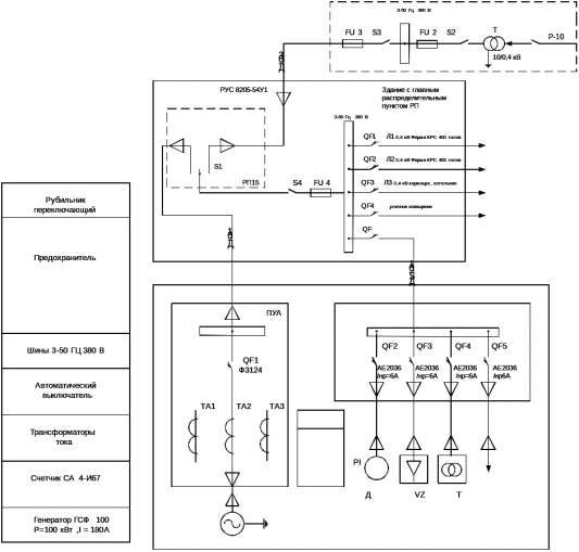 Ниже представлена однолинейная схема из одного варианта схемы электрических соединений ДЭС и связи электроагрегата с сетью 380 В группы резервных потребителей с распределительным пунктом.