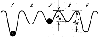 Таким чином, разупорядочение в кристалах має глибокий стимул, що йде від самої суті речей. Щоб конкретніше пояснити це найважливіше для наступного положення, звернемося знову до моделі кристалічної структури. Іони, що утворять ґратку, займають визначені положення в просторі. Спробуємо наочно представити, що утримує їх у цих фіксованих положеннях. Усі частки у твердому тілі — у тому числі іони в кристалі —.знаходяться в полі навколишніх їхніх часток. Результуюче колективне силове поле змінюється в просторі від точки до точки, створюючи своєрідний «енергетичний рельєф місцевості». Вид такого «рельєфу» уздовж одного з напрямків для іона, що знаходиться в кристалі, схематично зображений на мал. 4. І міжвузілля, і вузли — це як би ямки для важкої кульки — іона. Глибокі ямки відповідають вузлам, а більш дрібні — міжвузіллям. Співвідношення між кількістю вузлів і міжвузілль залежить від конкретної структури кристалічних ґрат. При температурі абсолютного нуля Т=0, відповідно до термодинамічних принципів, система знаходиться в найнижчому енергетичному стані: всі іони розташовані в глибоких ямках — вузлах, а між вузлами іонів немає. Нехай тепер температура підвищилася: Т>0. Разом з температурою збільшилася й амплітуда коливань кристалічних ґрат. У результаті таких теплових коливань, тобто як би тремтіння дна і стінок ямки разом з іоном, іон здобуває мож