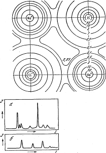 На мал. 8 зображена карта розподілу щільності заряду в одній із площин кристала повареної солі, отримана методом рентгенівського дослідження. Обрана площина (названа базовою) перетинає іони Na+ і CI-. Подібно тому як на географічних картах суцільними тонкими лініями з'єднуються точки, що мають однакову висоту над рівнем моря, так тут ці «лінії рівня» з'єднують точки, що характеризуються однаковими густиеами заряду. Іонам натрію, зарядженим позитивно, відповідають «гори», чи «вершини», а іонам хлору — «западини». Заряди іонів рівні по абсолютних величинах. Тому обсяг гір, що піднімаються над рельєфом, дорівнює обсягу поглиблень, утворених западинами. Чітко видно, що розподіл заряду поблизу кожного іона, як і слід було очікувати для іонних кристалів, має сферичну симетрію: вершини і западини мають конусоподібну форму. Симетрія трохи порушується в області зіткнення сусідніх іонів, причому видно також, що розміри (радіуси) іонів С1- помітно більше розмірів іонів Na+. Нарешті, дуже важливо, що всі лінії рівнів замкнуті: фізично таке положення речей означає, що електричні заряди не переміщуються за межі кристалічнї комірки і, таким чином, електрична провідність відсутня.