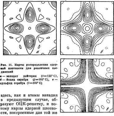 На мал. 11, а приведена карта ядерної щільності, знайденої для сполуки ванадію V з дейтерієм D. Атоми ванадію в цій сполуці формують объемно-центрированную кубічну ґратку (ОЦК-решітку). Така ґратка утворюється, якщо формуючі її частки розміщаються в кутах і в центрі куба. Структурний елемент ОЦК-решітки виходить із зображеної на мал. 2, а, якщо центральний атом (світлий кружок) уявно замінити на чорний. Безліч таких підбудованих один до одного центрованих кубів і утворюють Оцк-решітку. Атоми дейтерію розміщаються між атомами ванадію усередині утворених ними чотиригранників (тетраедрів). Площина, для якої побудована карта, перетинає чотири атоми дейтерію.
