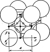 Його тверда структура являє собою щільно упаковані аніони йоду І-, що утворюють об’ємно-центровану кубічну ґратку (мал. 12). Так званий елементарний осередок таких ґраток включає два іони — центральний іон куба і по 1/8 від кожного з восьми іонів у вершинах куба. Усі ґратки відтворюються трансляціями (повтореннями) елементарного осередку в трьох взаємно перпендикулярних напрямках.