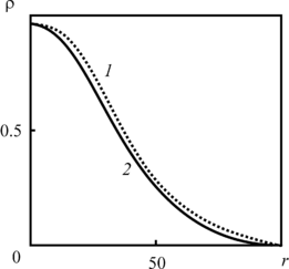 Рис. 2.36. Зависимость плотности радиоактивного загрязнителя от расстояния до оси скважины. Графики построены (для безразмерного времени t = 100): методом сеток – 1 и методом асимптотического разложения – 2. Другие расчётные параметры At = 0.1, Pd = 102, ,