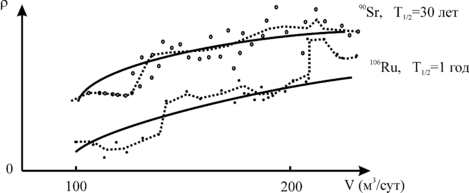 Рис. 2.37. Сопоставление зависимости плотности радиоактивных нуклидов от интенсивности закачки на расстоянии 200 м до оси скважины для момента времени t = 5 лет. V – интенсивность закачки