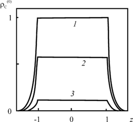 Рис. 2.35. Зависимость плотности радиоактивных примесей для стационарного случая (нулевое приближение) от координаты z при различных расстояниях до скважины: 1 r = 0, 2 100, 3 200. Другие расчётные параметры At = 0.01, Pd = 102, ,