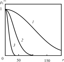 Рис. 2.34. Зависимость плотности радиоактивных примесей в пористом пласте для стационарного случая (нулевое приближение) от расстояния до скважины при различных постоянных распада: 1 At = 0.01, 2 0.1, 3 1. Другие расчётные параметры Pd = 102, ,