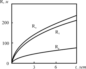 На рис. 3.3 приведены характерные зависимости от времени размеров зон загрязнения – Rp, теплового влияния – RТ и чистой воды – Rw. При этом область шириной ΔRw=Rw–RТ заполнена чистой водой, имеющей температуру, равную естественной температуре пласта. С течением времени ширина этой области увеличивается.