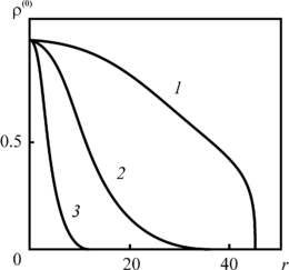 | Рис 2.4. Зависимость плотности радиоактивных примесей (нулевое приближение) от расстояния до оси скважины для различных моментов времени: 1 – t = 1, 2 – 10, 3 – 100. Другие расчётные параметры At = 0.1, |