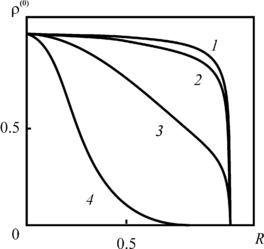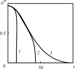 На рис. 2.5 приведены результаты расчётов плотности радиоактивных примесей в нулевом приближении в зависимости от безразмерной пространственной координаты, отнесённой к радиусу зоны загрязнения (