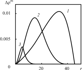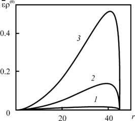 | Рис. 2.1. Зависимость разности (для нулевого приближения) между плотностями загрязнителя в пористом пласте без учёта и с учетом радиоактивного распада в водоупорных пластах от координаты r при различных постоянных распада 1 – At = 0.1, 2 – 1, 3 – 10. Другие расчётные параметры t = 10, |