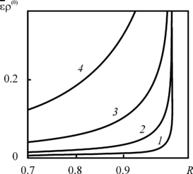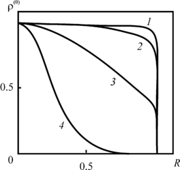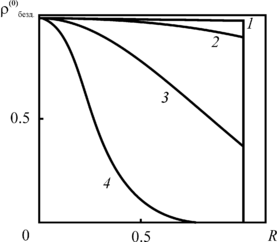 | Рис 2.6. Зависимость плотности радиоактивных примесей (нулевое приближение) от расстояния до оси скважины, отнесенного к радиусу зоны загрязнения, для различных постоянных распада 1 – At = 0, 2 – 0.01, 3 – 0.1, 4 – 1. Другие расчётные параметры t = 10, |