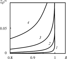 | Рис. 2.9. Зависимость относительной погрешности бездиффузионного приближения от расстояния до оси скважины, отнесенного к радиусу зоны загрязнения, при различных временах закачки 1 – t = 0.1, 2 – 1, 3 – 10, 4 – 100. Pd = 102, |