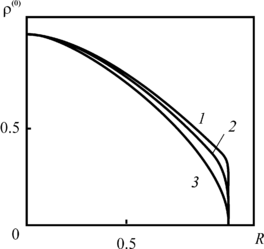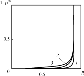 | Рис. 2.8. зависимость плотности загрязнителя (нулевое приближение) от расстояния до оси скважины, отнесенного к радиусу зоны загрязнения, при различных временах закачки и постоянных распада 1 – t = 0.1, At = 10, 2 – t = 10, At = 0.1, 3 – t = 100, At = 0.01, |