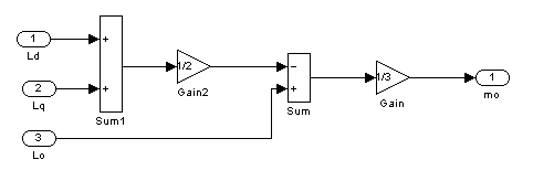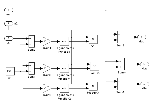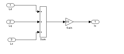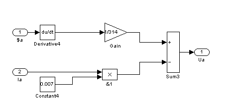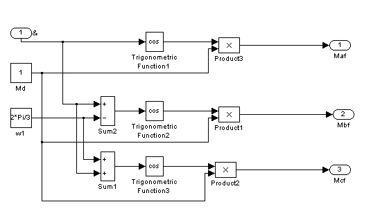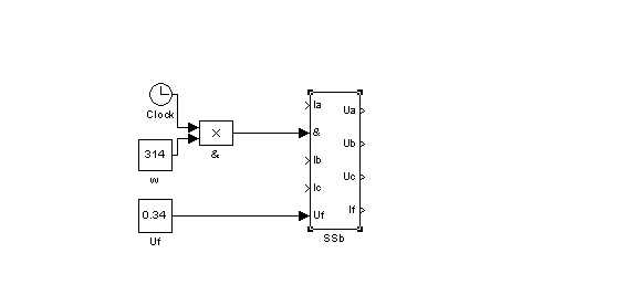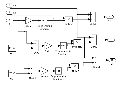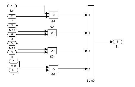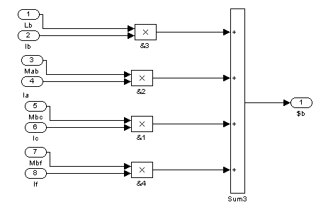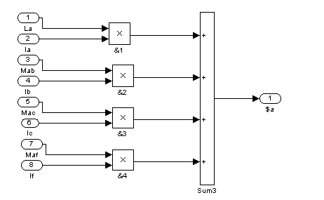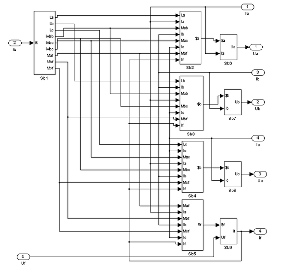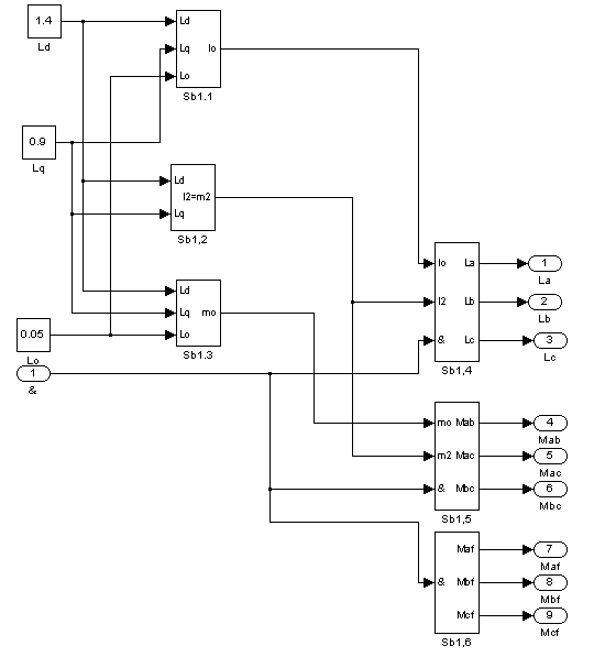 Первый суперблок в свою очередь состоит из подблоков. Первые три моделируют постоянные коэффициенты , , , ; подблоки 4 – 6 моделируют индуктивности , , ; подблоки 7 – 9 моделируют взаимоиндукцию между фазами , , ; подблоки 10 – 12 моделируют взаимоиндукцию между обмотками возбуждения и фазными обмотками статора.