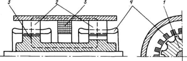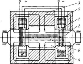 Подавляющее число машин постоянного тока выполняется с коллектором - механическим преобразователем частоты. Но существует несколько типов и бесколлекторных машин, например униполярные генераторы (рис. 5), которые используются для получения больших токов (до 100 кА) при низких напряжениях. В таких машинах коллектор отсутствует, но они могут работать только при наличии скользящего контакта, который состоит из щеток 1 и колец 2. Постоянный магнитный поток, созданный токами обмотки возбуждения 5, замыкается по станине 3, массивному ротору 4 и двум зазорам. Постоянные токи наводятся в массивном роторе и снимаются щетками. Чтобы уменьшить электрические потери в роторе, в нем делают пазы, в которые укладывают медные стержни 6. Стержни, приваренные к контактным кольцам, образуют на роторе короткозамкнутую обмотку.
