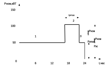 В том случае, когда в стандарте есть одно или даже два значения номинальной мощности, которые размещаются в этих пределах, следует проверить их достаточность. Для этой цели предлагается преобразовать любой график нагрузки в эквивалентный по количеству выделяемого тепла прямоугольный двухступенчатый. Такой график считается эквивалентным действительному по температуре. На рис. 2 представлен двухступенчатый график нагрузки. В периоды 1 и 3 действует нагрузка Pэ с, а в период 2 – нагрузка Pэ max.