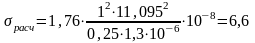 Механическое напряжение в материале шины при длине пролета l=1 м и расстоянии между шинами фаз а = 0,25 м