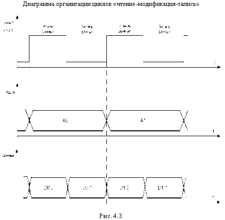 Так продолжается накопление данных в 4096 каналов после чего следует период нерабочего состояния системы регистрации длительностью 11 мс. За это время может быть произведена быстрая автоматическая трансляция в буферное ОЗУ данных накопленных в ОЗУ1 или ОЗУ2. Процесс передачи данных не обязательно должен производится в конце каждого цикла регистрации. Периодичность обмена определяется степенью загрузки трактов. Даже при высоких параметрах загрузки порядка 106 имп./с чтение ОЗУ необходимо производить в конце каждого десятого цикла регистрации. Таким образом работа с данными в накопительных ОЗУ (ОЗУ1 и ОЗУ2) производится по принципу «чтение-модификация-запись» (рис.4.3) Это относится и к режиму накопления и к режиму автоматической трансляции. В последнем случае на место прочитанных и переданных в буферное ОЗУ данных записывается нуль.