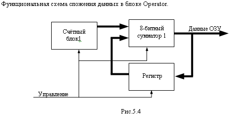 Основные функции работы модуля накопления реализованы в блоке Kern. Он содержит в себе операционный блок (Operator) в котором, совместно с внешними, относительно ПЛИС, элементами ОЗУ выполняется алгоритм накопления первого байта данных. Кроме того, блок Kern включает в себя схему выработки адреса ячеек ОЗУ (Adr), работающую в режиме последовательного пересчёта.