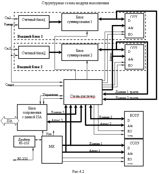 Входные блоки модуля накопления выполняют накопление и промежуточное хранение данных первого (младшего) байта. Основными структурными элементами здесь являются счётные блоки, блоки суммирования, и накопительные ОЗУ. Адресация ячеек ОЗУ происходит синхронно канальным импульсам системы регистрации. Накопление происходит непрерывно в каждом цикле регистрации. Число каналов накопления может быть задано. В соответствии с алгоритмом программы микроконтроллера периодически (один раз за несколько циклов регистрации) должна происходить быстрая автоматическая трансляция данных одного из накопительных ОЗУ в буферное ОЗУ.