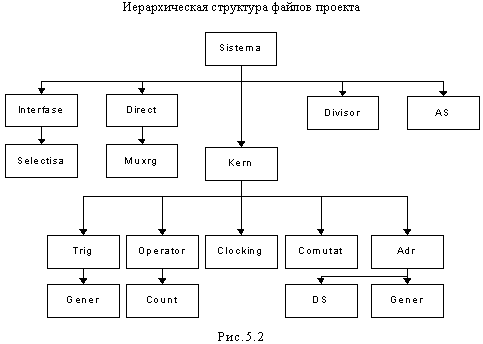 Дизайн проекта выполнен в виде иерархической структуры файлов созданных в графическом редакторе системы MAX+PLUS II (рис.5.2). Для тестирования, как отдельных узлов, так и всего проекта использовался сигнальный редактор.