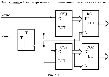 Для реализации счётного блока с минимальными значениями параметра мёртвого времени на канал используется схема, состоящая из двух буферных счётчиков. Переключение потока входных импульсов между счётчиками производится управляющим триггером синхронно канальным импульсам системы регистрации (рис.5.3).