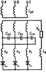 В данной схеме между фазами включена трехфазная группа конденсаторов (САВ, СВС, ССА), которая создает опережающий сдвиг по фазе тока относительно вектора напряжения. В обычной трехфазной схеме преобразования переход тока с одной фазы на другую происходит в момент, когда сравниваются напряжения этих фаз: UA=UB. В компенсационном преобразователе благодаря действию конденсатора коммутация происходит раньше, в момент, когда UA = UB + UABемк, где UABемк – напряжение на конденсаторе САВ.