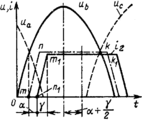 При работе трехфазного преобразовательного агрегата переход тока с фазы А на фазу В (рисунок 3) происходит не в момент равенства напряжений: UA=UB, а занимает некоторое время коммутации и происходит с запаздыванием на соответствующий этому времени угол коммутации , в течение которого напряжение UB превысит UA на достаточное для перехода тока значение.