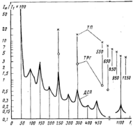 Фильтрация гармоник тока нагрузки (функция 8) достаточно проста, если спектр тока линейчатый и быстрозатухающий с ростом частоты. Такой спектр имеют токи тиристорных преобразователей с нагрузкой на стороне постоянного тока, выпрямители и инверторы передач постоянного тока, мощные выпрямители электролизных установок и др. Амплитуды гармоник тока шестипульсного тиристорного преобразователя даны на рисунке 21 (точки ТП).
